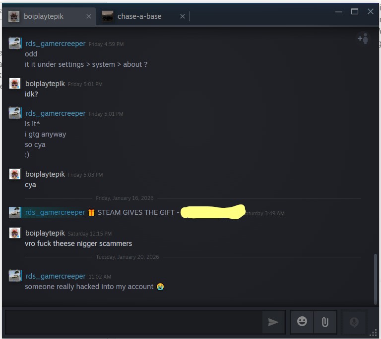 Well, the worst thing happend, my steam account hacked! And this is a reminder, change your password before you’re next, thankfully I was able to recover it. If my account on here gets hacked and you see me posting some sort of free gift with a link DO NOT click it. Worst comes to the worst and that does happen please ignore them. Now I’m left with a scam message made by whoever hacked into my account on all my freinds chat messages…