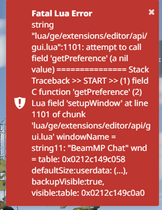 When ever I join a server the chat fails to launch and I am given an error message. I have tried redownloading Beam MP repairing Beam MP and verifying that the chat is there in UI settings.