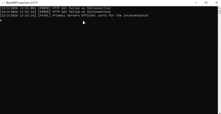 “[ERROR] HTTP Get failed on SSLConnection”, после этого просто закрывается и всё. я уже переустанавливал beammp кучу раз, перезагружал ноутбук, но ничего не помогает