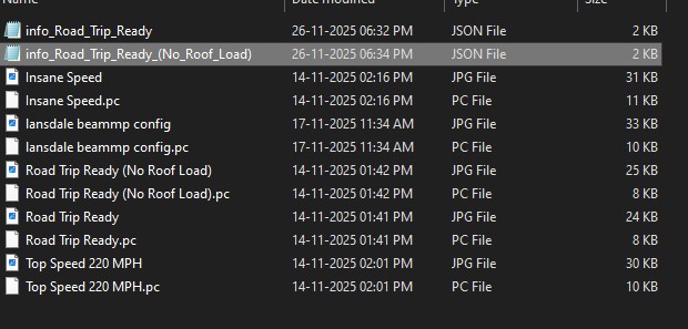 The config name should be the exact same. So info_Road Trip Ready.json without underscores like the .pc file name.