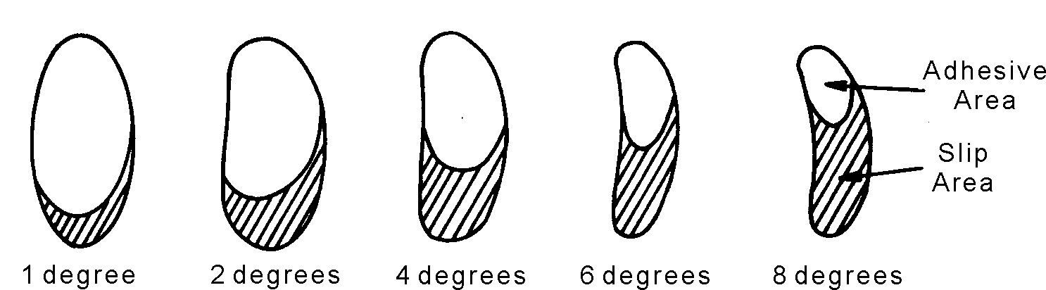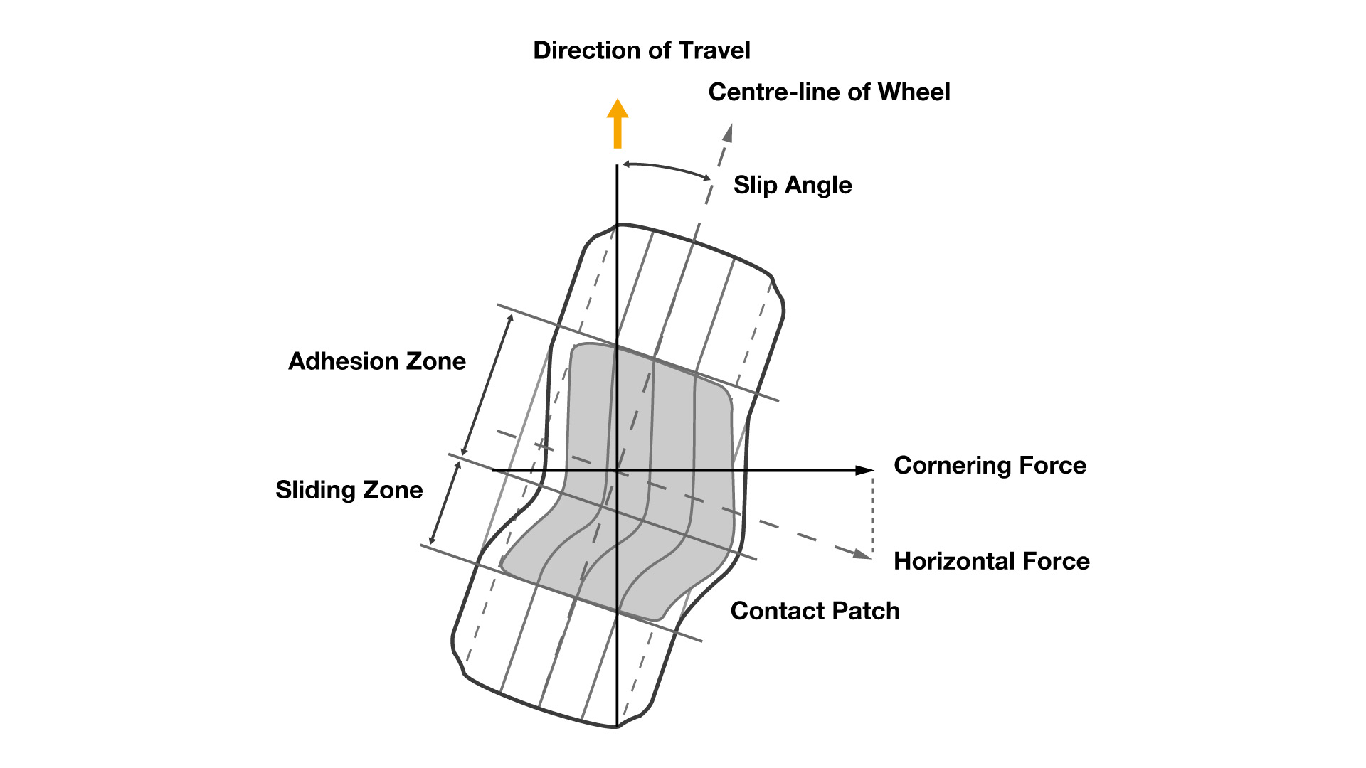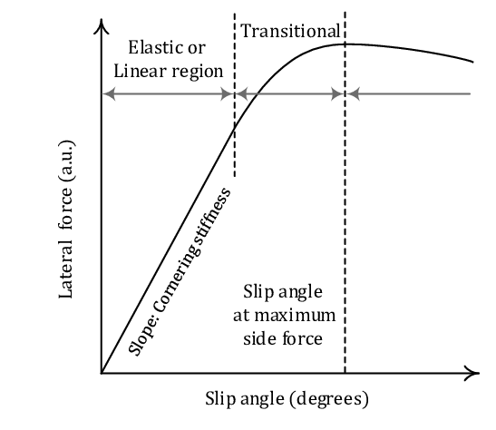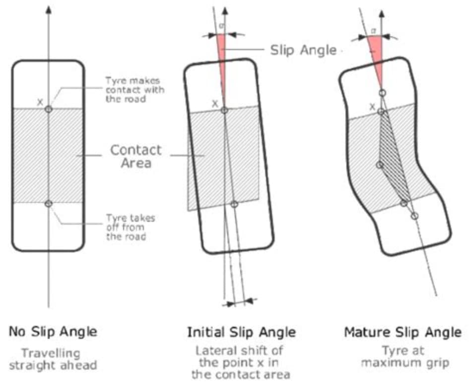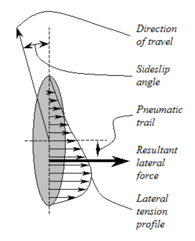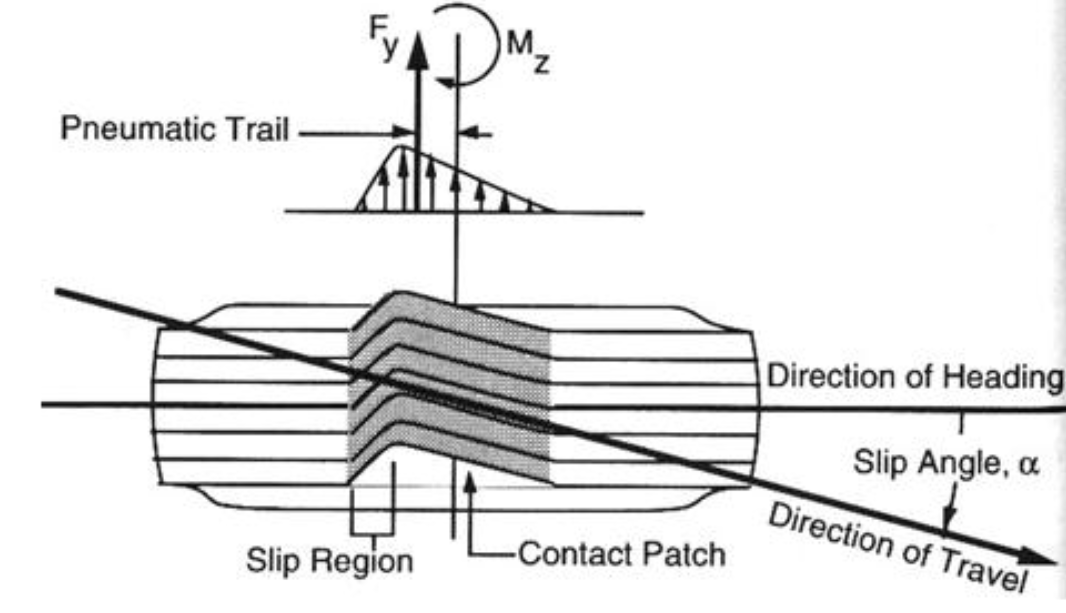 per every degree of slip angle, the cornering force increases to a maximum (peak; limit), until the adhesive area (stick zone) of the contact patch is exceeded by the slippage (slip area) (creepage), as it begins to decrease. the rate at which it builds up is described by relaxation length and the distance of the pneumatic trail, which creates a self aligning torque (moment) at the trailing edge (behind) of the contact patch, before returning to its original (linear) shape.