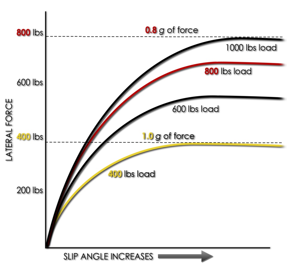 you can test how much of this lateral force your vehicle is able to withstand at a given slip angle by observing it dynamically via a GG diagram (accelerometer) and experimenting to determine at what limit (peak) does frictional (kinetic) slip and loss of traction (grip) develop.