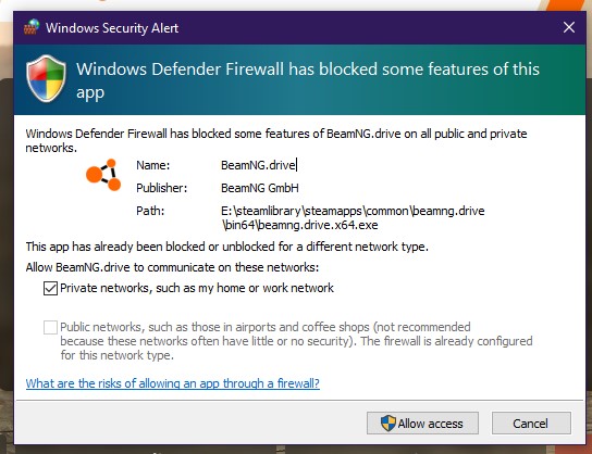 Well given that I have no other devices on my network that have BeamNG, I don’t think it’ll make a big difference that I allowed access.